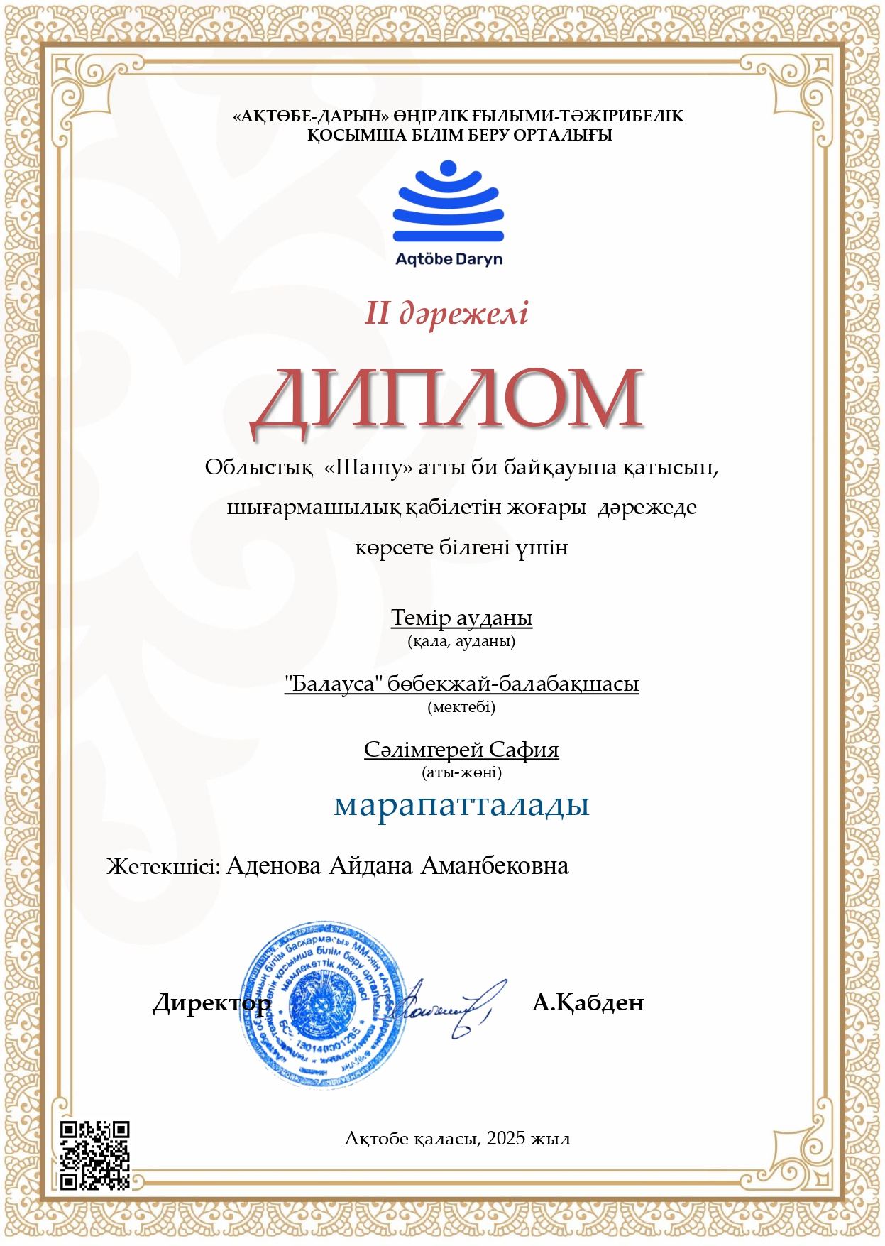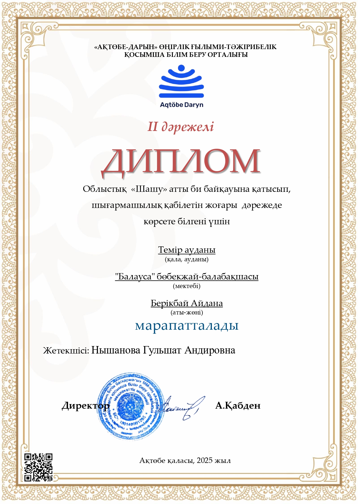 «Ақтөбе-Дарын» ӨҒТҚББО ұйымдастыруымен өткен облыстық «Шашу» атты би байқауына қатысып, шығармашылық қабілетін жоғары дәрежеде көрсете білгені үшін “Балапан” тобы тәрбиеленушілері Сәлімгерей Сафия, Нұрмұхамбет Медина, Берікбай Айдана 2 дәрежелі Дипломмен марапатталды.